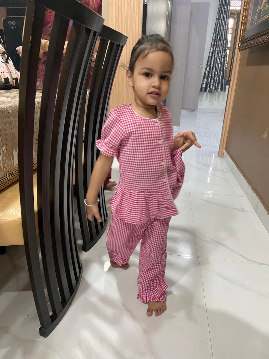 Pink is the magic word, and the magic color. When your sweet, little girl puts on the pink gingham check night suit, she will feel more confident than she ever has in her life. The gathered waist yolk and front button fastening bring a stylish element to a practical wear Night Dress for 10 Years Girls. The regular fit and short sleeves make this fashionable product comfortable as well. The round neck allows for breathing space and the elastic waist bottom makes room for flexibility. Finally, the ruffle detailing at the hem creates a nice look and the side pockets bring convenience to the forefront.